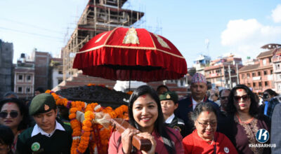 काठमाडौं– कुमारी घरबाट चोरी भएका तोरणहरूमध्ये एक तोरण बेलायतको बाराकाट ग्यालरीमा फेला परेर फिर्ता ल्याई हाल राष्ट्रिय संग्रहालयमा राखिएको थियो । बाजा बजाएर पूजा गरेपछि कुमारी घरको मुख्य ढोकाको दायाँपट्टि रहेको झ्यालमाथिको उक्त तोरण पुनर्स्थापना गरिएको छ। तस्बिरहरू: सफल प्रकाश श्रेष्ठ / नेपाल फोटो लाइब्रेरी