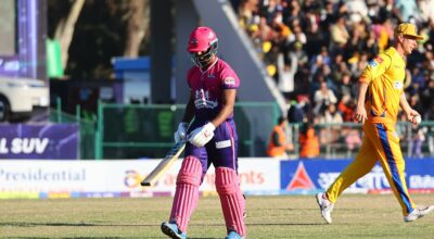 काठमाडौं- नेपाल प्रिमियर लिग एनपीएलमा अहिले जनकपुर बोल्ट्स र सुदूरपश्चिम रोयल्सबीच प्रतिस्पर्धा भइरहेको छ । खेलमा जनकपुर बोल्ट्सले दोस्रो विकेट गुमाएको छ । खेलको २ ओभर २ बलमा जनकपुरका मयन यादव आउट भए । उनलाई स्कट कुगलाइनले एलबीडब्लू आउट गरे । आउट हुनुअघि उनले १० बलमा ६ रन जोडे । उनले एक चौका प्रहार गरे […]