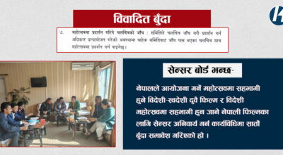काठमाडौं – नेपाली फिल्म क्षेत्रमा सेन्सरको विवाद नयाँ होइन । सञ्चार तथा सूचना प्रविधि मन्त्रालयअन्तर्गतको सेन्सर बोर्ड (केन्द्रीय चलचित्र जाँच समिति) र चलचित्र मेकरहरुबीच ठाकठुक परिरहन्छ । बोर्डले आपत्ति लागेका दृश्यमा कैँची चलाउँछ, र, कुन उमेर समूहकाले हेर्न मिल्ने भनेर वर्गीकरण गरी प्रमाणपत्र दिन्छ । त्यहीअनुसार फिल्म प्रदर्शनमा आउँछन् । यो मेकरहरूलाई चित्त नबुझेको विषय […]